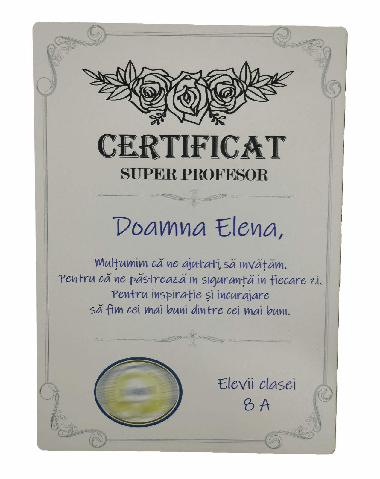 Un certificat este un document unic imprimat pe care îl poți personaliza și adăuga: o urare unică sau o dedicație proprie pentru profesorul tau drag.  Certificatul este un cadou pe care îl poți personaliza în totalitate și îl poți adapta în funcție de destinatar.