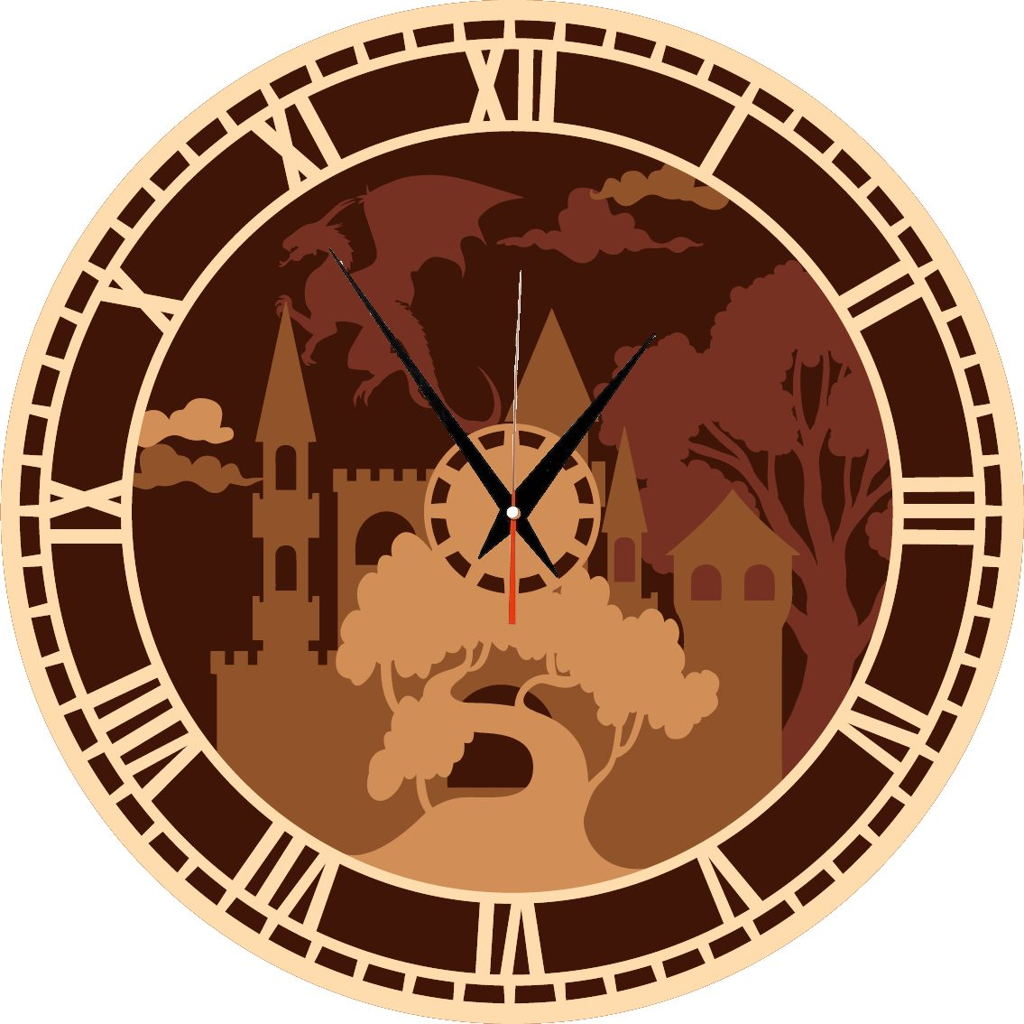 Ceasul este realizat din lemn de plop, cu grosimea de 3 mm, dispus in mai straturi, debitat laser cu o maxima precizie a detaliilor. Straturile din lemn, slefuite si vopsite UV sau manual sunt imbinate intre ele creandu-se astfel efectul 3D.
