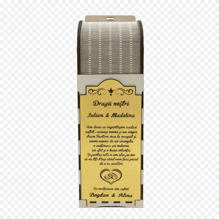 Bucurați-vă de un cadou elegant și personalizat pentru a marca ocazii speciale cu o cutie de vin personalizată! Această cutie este perfectă pentru a oferi un cadou deosebit, adăugând un plus de eleganță și originalitate. Ceea ce face această cutie de vin cu adevărat specială este posibilitatea de a o personaliza. Realizată cu dragoste și precizie din lemn, această cutie nu este doar frumoasă la vedere, ci și practică și durabilă. Fie că este vorba de o aniversare, ziua de naștere, nuntă sau o piatră de hotar importantă în viață, cu cutia noastra de vin din lemn vei evidenția importanța acestor momente. Unele ocazii merita mai mult decat un cadou. Realizate cu atenție la detalii și calitate, cutiile noastre sunt concepute pentru a rezista testului timpului și a deveni un suvenir frumos care poate fi afișat ca decor mult timp după ce vinul a fost savurat.