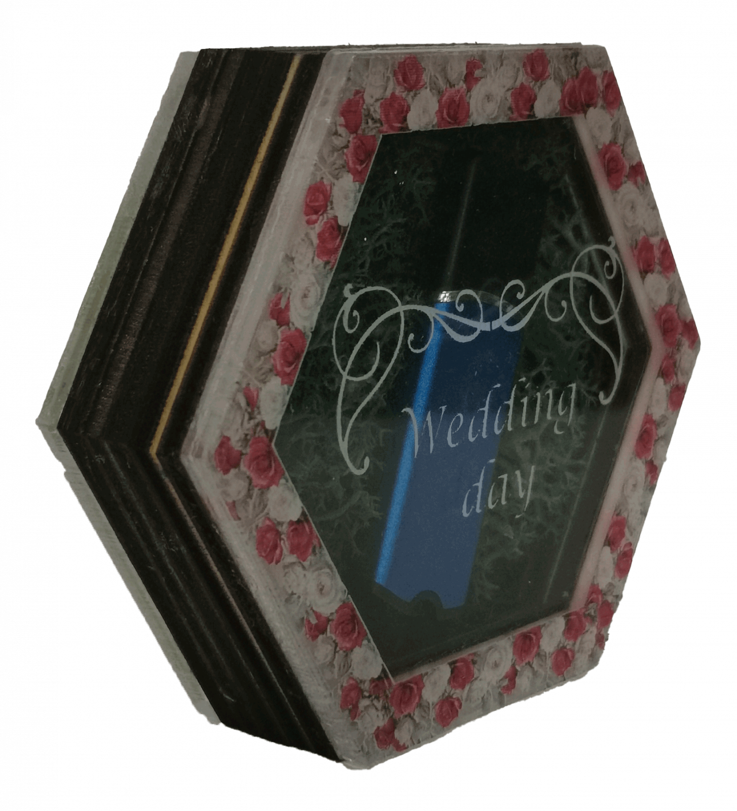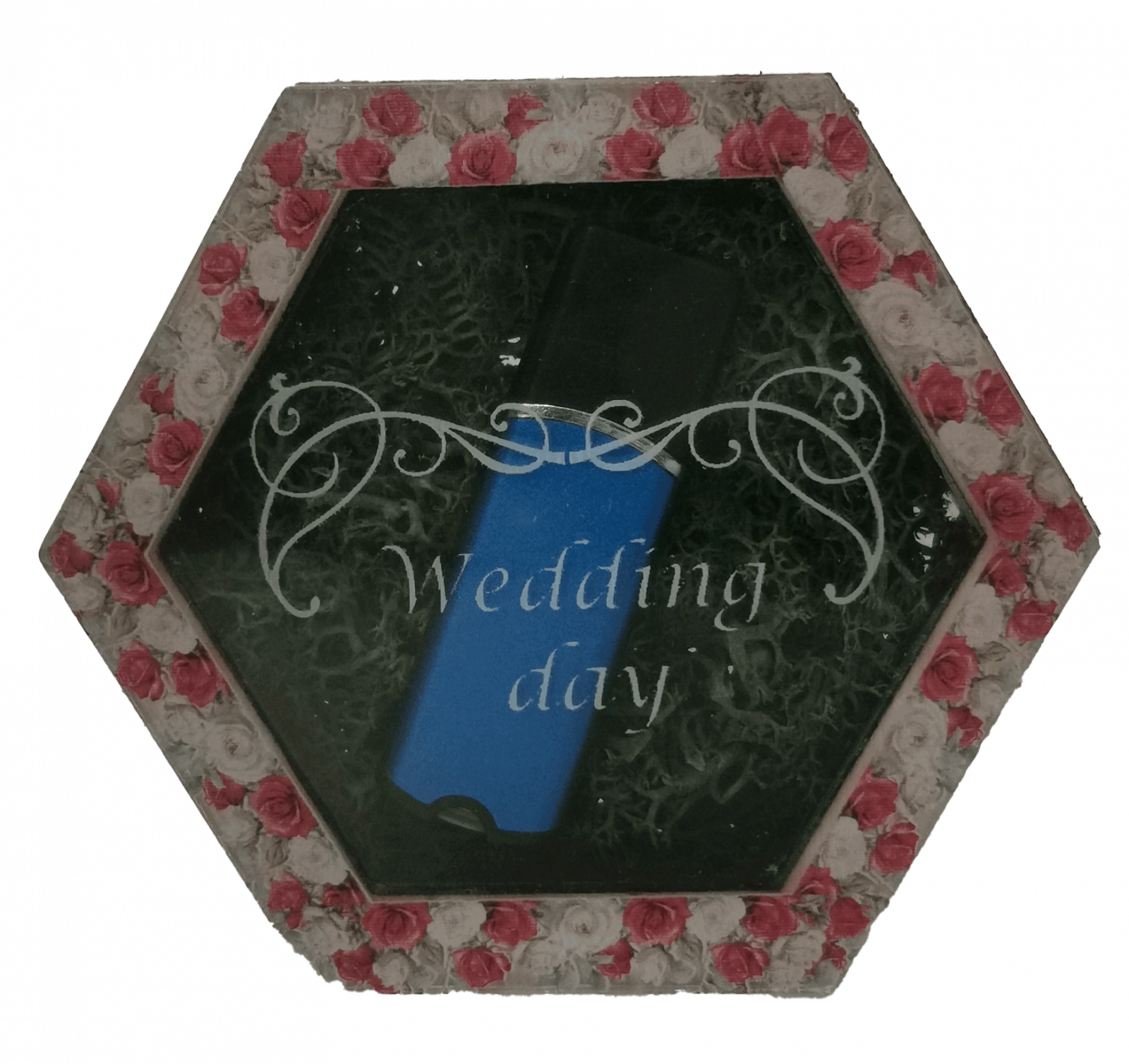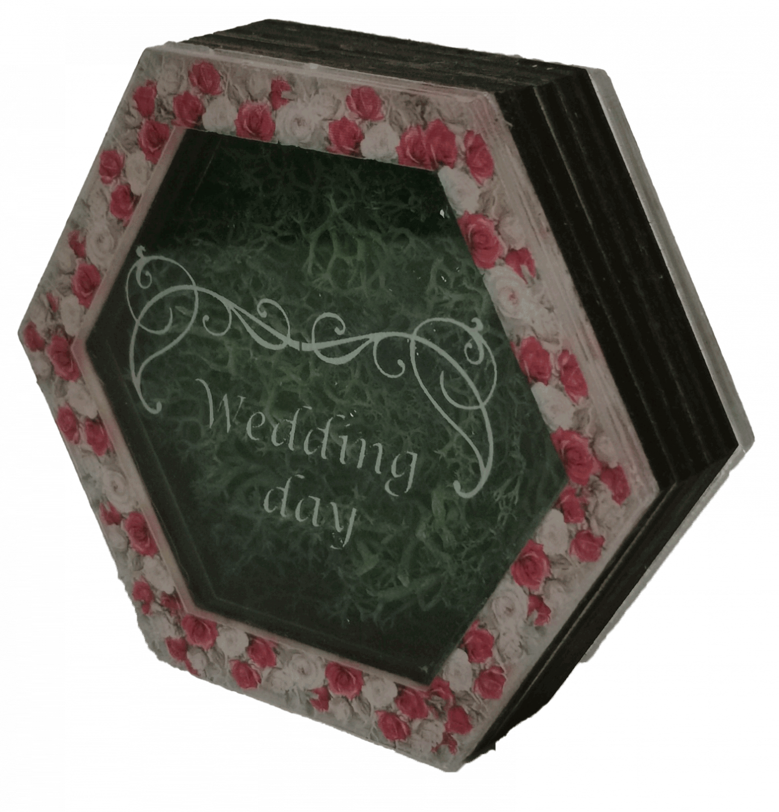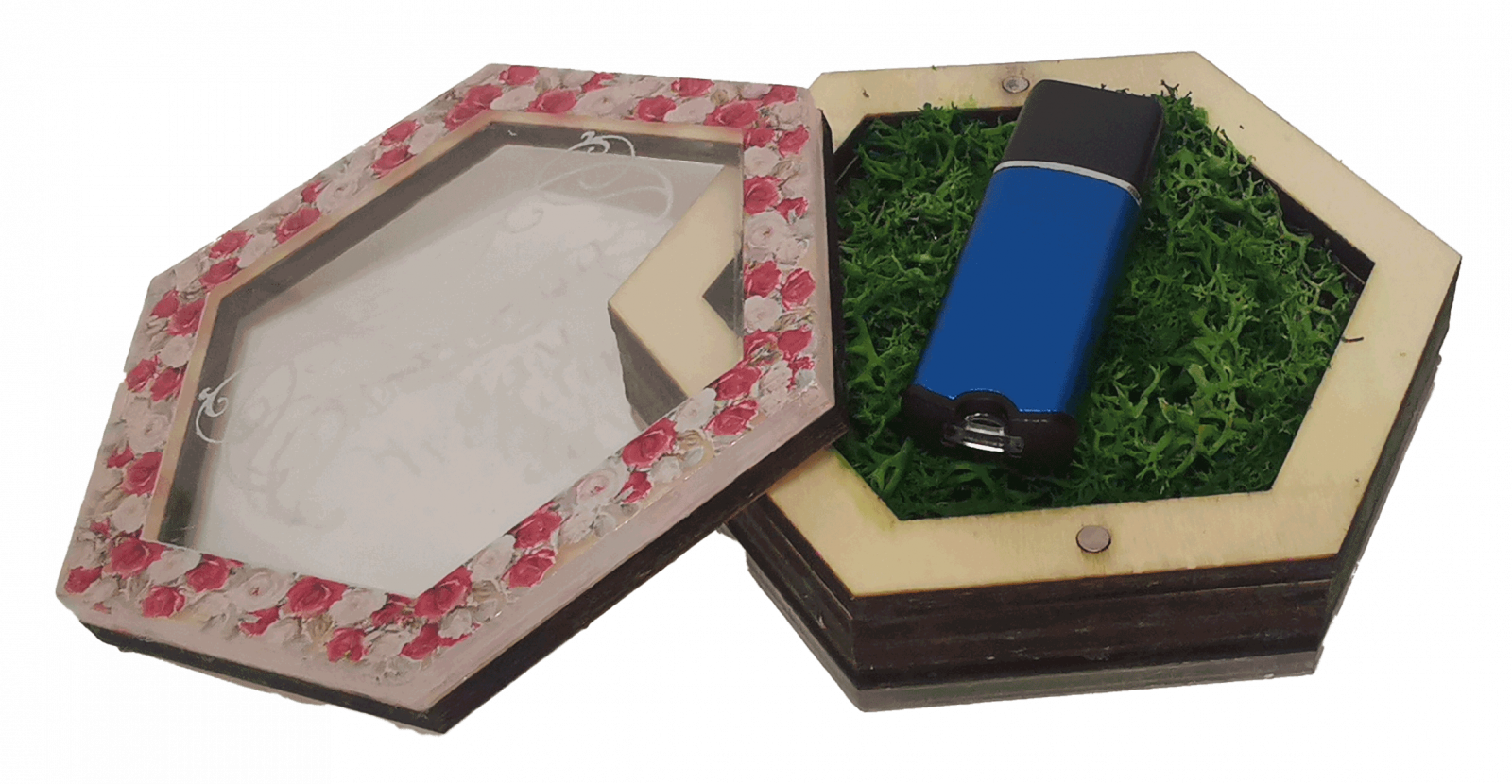 Nice 3D Gifts va pune la dispozitie cutia pentru stick USB Hexagonala. Este realizata din lemn de plop, material acrilic si licheni avand aspectul unui hexagon.