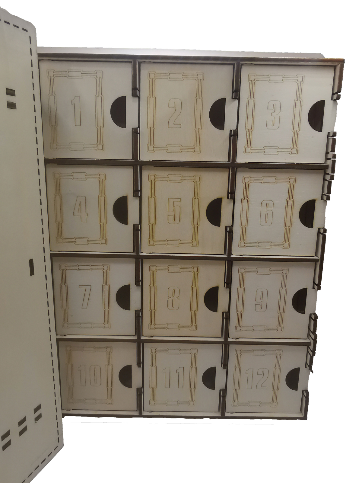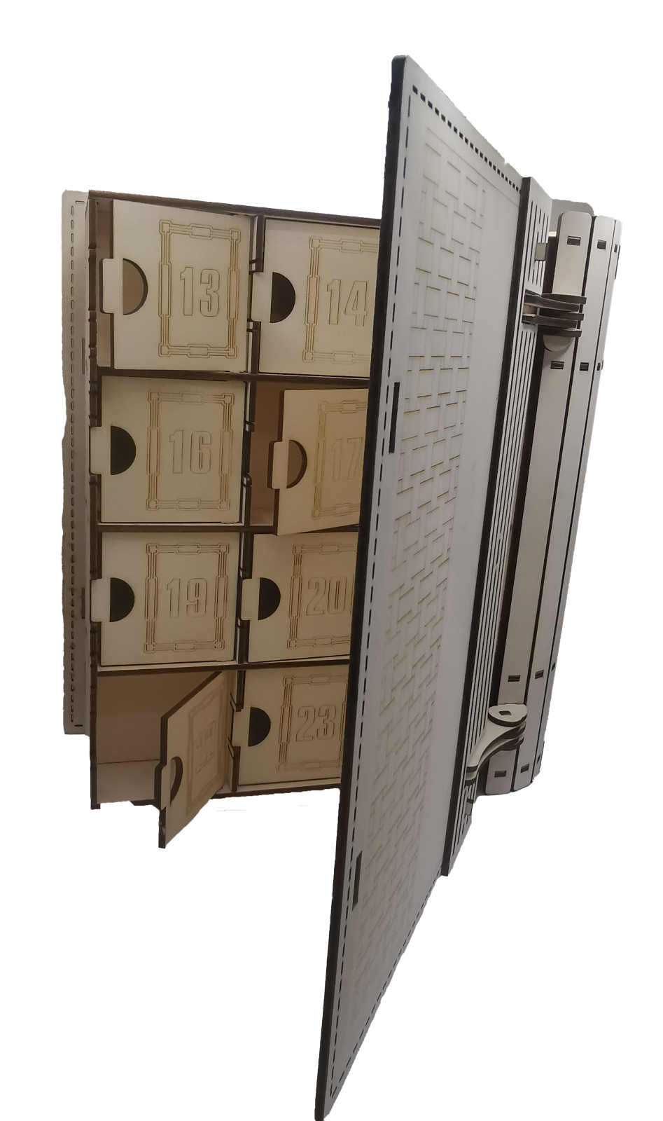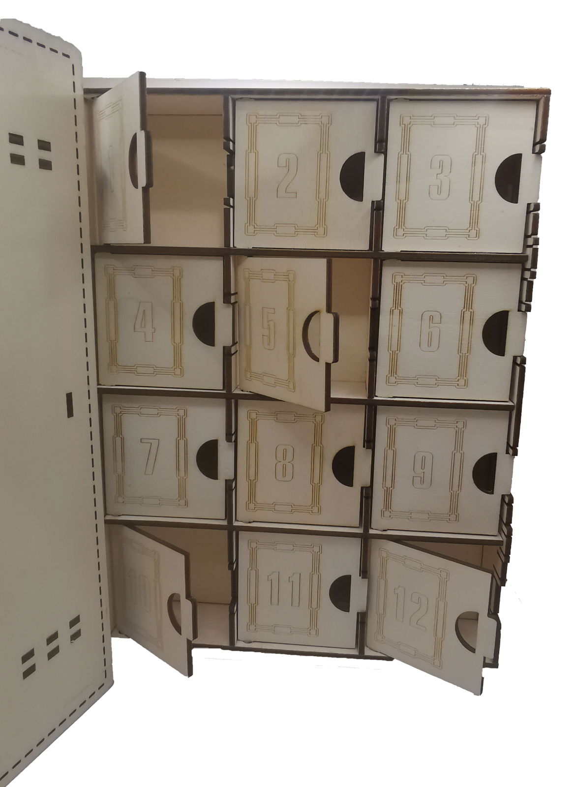 Dotat cu 24 de sertare mici din lemn care se potrivesc perfect într-un cadru din lemn asortat, acest calendar poate fi umplut cu dulciuri la alegere. Cadouri mici, precum ciocolată și bomboane delicioase, jucării și multe alte mici comori pot fi ascunse în fiecare sertar pentru a-ți încânta copilul în fiecare zi din decembrie.