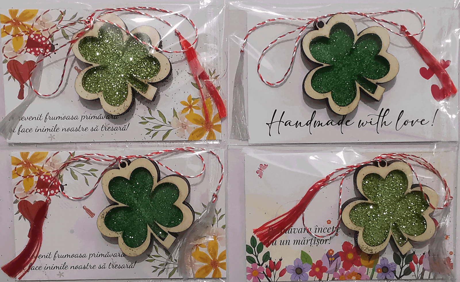 Martisorul este realizat din 2 straturi de lemn in forma de trifoi si sclipici decorativ