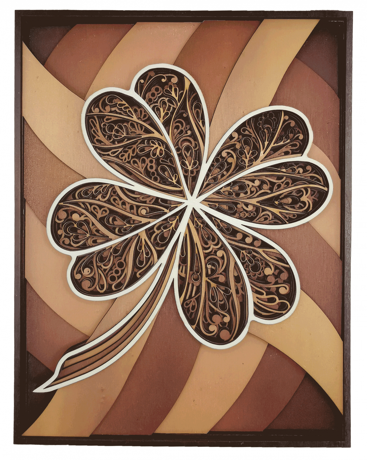 Trifoiul norocos multistrat 3D este realizat din lemn, cu grosimea de 4 mm, dispus in mai multe 6 straturi, debitat laser cu o maxima precizie a detaliilor. Straturile din lemn, slefuite si vopsite UV sau manual sunt imbinate intre ele creandu-se astfel efectul 3D.
