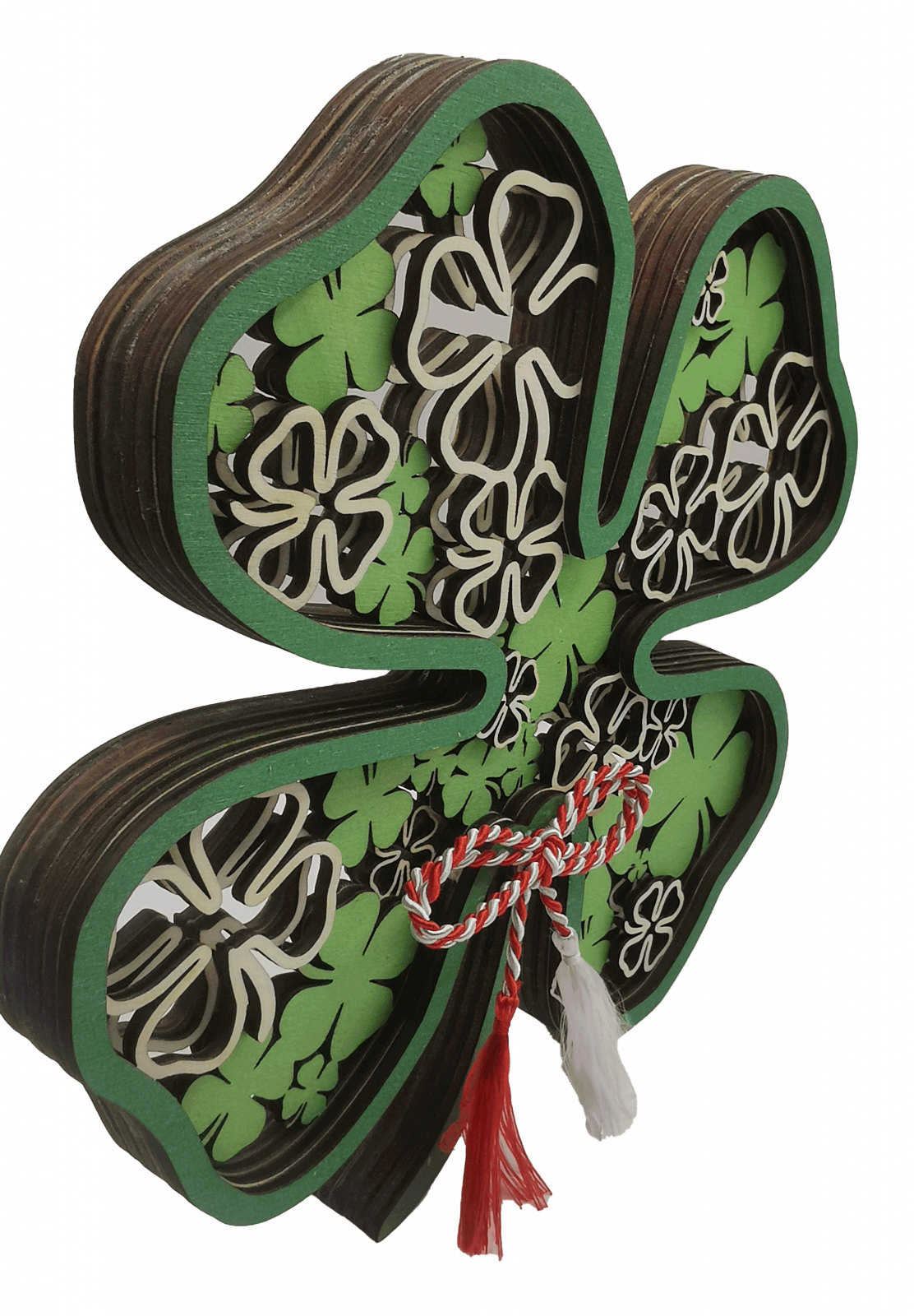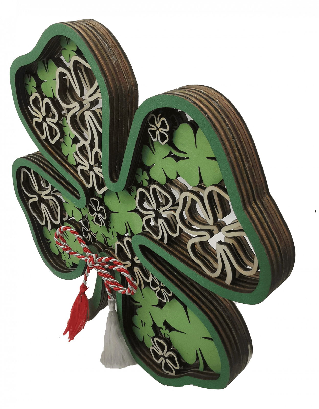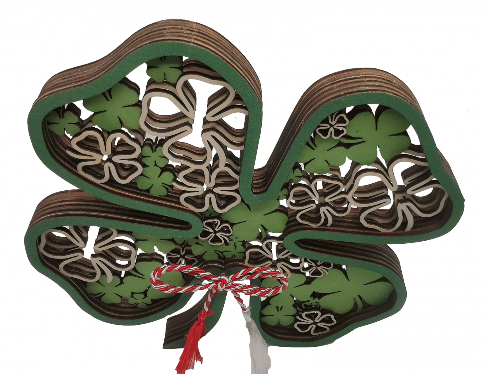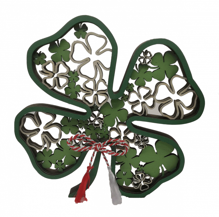 Martisorul este realizat din 6 straturi de lemn in forma de trifoi vopsite UV.