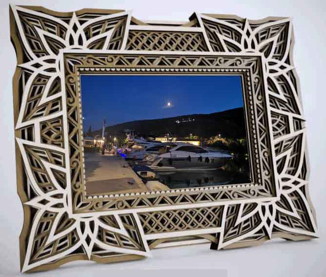 Rama foto este realizata in intregime din straturi de lemn printate UV. Fiecare strat are un design unic pentru a obtine un aspect 3D in urma imbinarii.