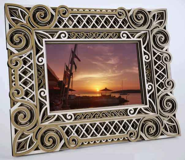 Rama foto este realizata in intregime din straturi de lemn printate UV. Fiecare strat are un design unic pentru a obtine un aspect 3D in urma imbinarii.