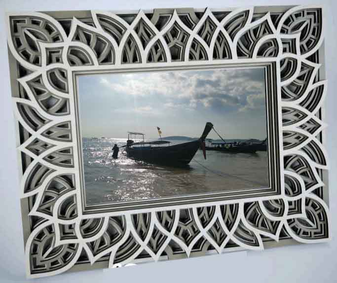 Rama foto este realizata in intregime din straturi de lemn printate UV. Fiecare strat are un design unic pentru a obtine un aspect 3D in urma imbinarii.