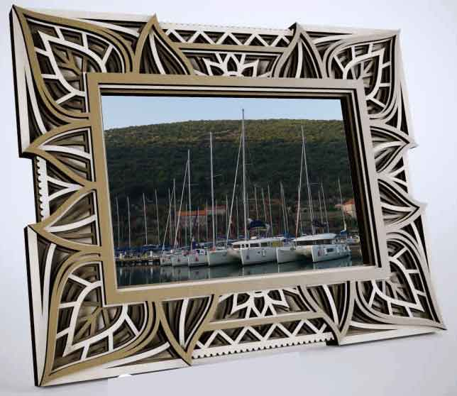 Rama foto este realizata in intregime din straturi de lemn printate UV. Fiecare strat are un design unic pentru a obtine un aspect 3D in urma imbinarii.