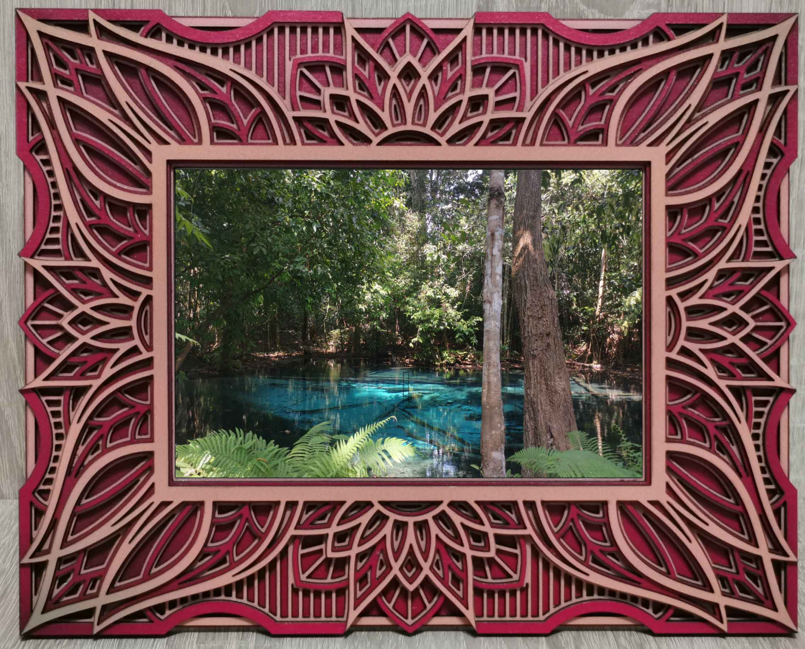 Rama foto este realizata in intregime din straturi de lemn printate UV. Fiecare strat are un design unic pentru a obtine un aspect 3D in urma imbinarii.