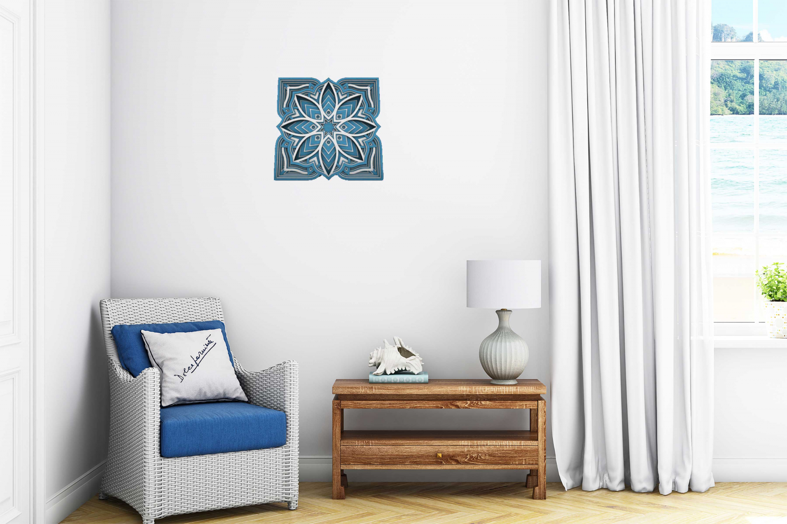 Tabloul este realizat cu multa atentie si pricepere, completeaza decorul camerei in care este montat, dand o nota de eleganta si rafinament. Mandala reprezinta echilibrul dintre  frumusetea interioara si cea exterioara a omului, armonia dintre trup si suflet. Aspectul simetric al mandalei ne capteaza atentia, scopul acesteia fiind de a medita si a ne conecta cu propria fiinta.